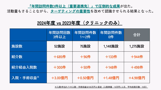 表が示す通り、年間3回以上訪問した施設群は、1回や2回の施設群に比べ、1施設あたりの紹介患者数も収益も格段に高くなりました。これは、反復訪問が関係性を深め、具体的な患者紹介に繋がったことを示唆しています。