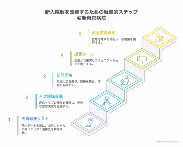 結果として、紹介経由の入院患者数は年間500人規模で増加し、約5億円の増収効果をもたらしました*。本稿(後編)では、新東京病院がどのように活動の質を高め、具体的な成果に結びつけたのか、その手法と他院でも応用可能なポイントを解説します。なお、本稿では、新東京病院様ならびに同院のプロジェクトに伴走されたメダップ株式会社のご厚意によりご提供いただいた資料(図)を掲載しております。