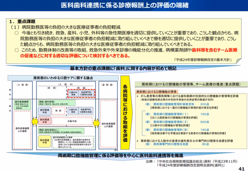 資料では、地域における歯科医療提供体制の再構築が大きなテーマとして挙げられています 。その中で病院歯科は、専門的な歯科医療の提供や人材育成の拠点としての役割に加え、地域の歯科診療所を後方支援する機能が期待されています 。