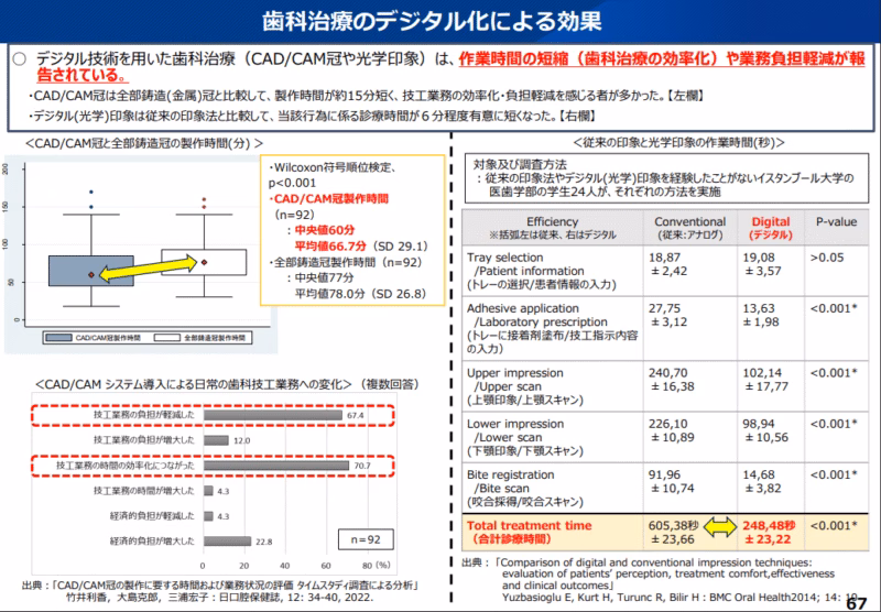 限られた医療資源を有効活用する観点から、歯科治療のデジタル化が強力に推進されます 。口腔内スキャナーによる印象採得(光学印象)やCAD/CAM技術を用いた補綴物(被せ物)の製作は、従来の方式に比べて作業時間の短縮や業務負担の軽減につながることが報告されています。