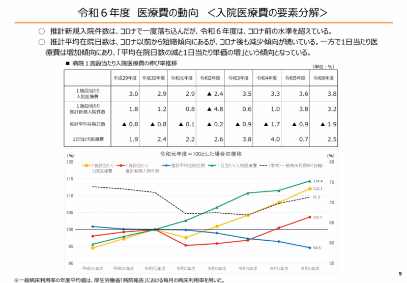病院経営で特に注目すべきは入院医療費の動向です。グラフに示されるように、コロナ禍で一度落ち込んだ推計新規入院件数は令和6年度にはコロナ禍前の水準を超えました。平均在院日数は短縮傾向が継続している一方で、1日当たり入院医療費は増加傾向にあります。これは、より短期間で密度の高い医療が提供されていることを示唆しており、各病院における診療の効率性と収益性の分析に重要なデータです。診療内容別に見ると、DPC包括部分や手術・麻酔、特定保険医療材料が医療費増に大きく寄与しています。